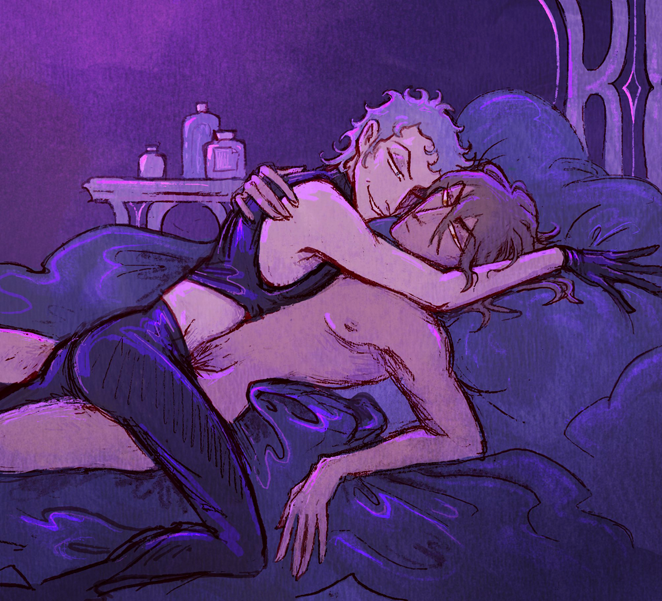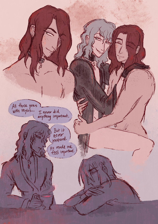 Betony pulls some strings to reassign Osprey as his knight and take over governorship of Eldis. Their antagonistic relationship leads to sadomasochistic venting in the bedroom, as both of them blame themselves and each other for Mylos' death and Lilian's disappearance. At the same time, they find unexpected common ground in each other. In Betony, Osprey finds someone willing to give him the attention (and punishment) he craves. And maybe there's something a little pathetic in Betony that he likes, too. Desperate to prove himself, Betony turns his attention to a secret project, which he employs Osprey in assisting him with. Still, Osprey is unconvinced that Lilian is dead. Though Betony keeps him on a tight leash, Osprey bides his time while waiting for his chance to slip away and search for him.(Also, at a certain point, Betony cuts his hair)